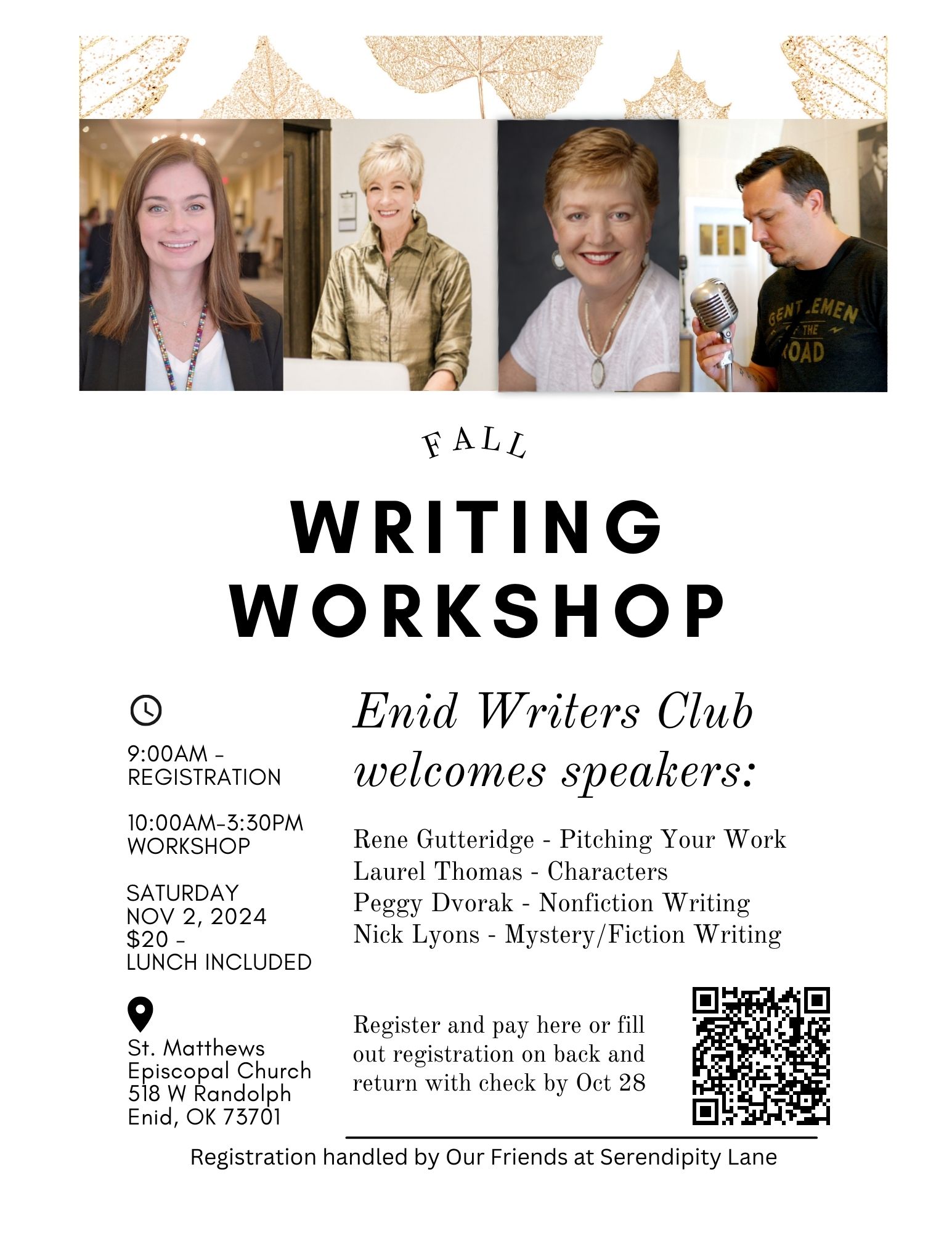 The Enid Writers Club will present their fall writing workshop on Saturday, November 2, 2024, at St. Matthews Episcopal Church, 518 West Randolph, Enid, OK 73701. The workshop will begin at 10 am—registration, coffee, and doughnuts at 9:00. We have 4 speakers, Rene Gutteridge, Laurel Thomas, Peggy Doviak, and Nick Lyon.